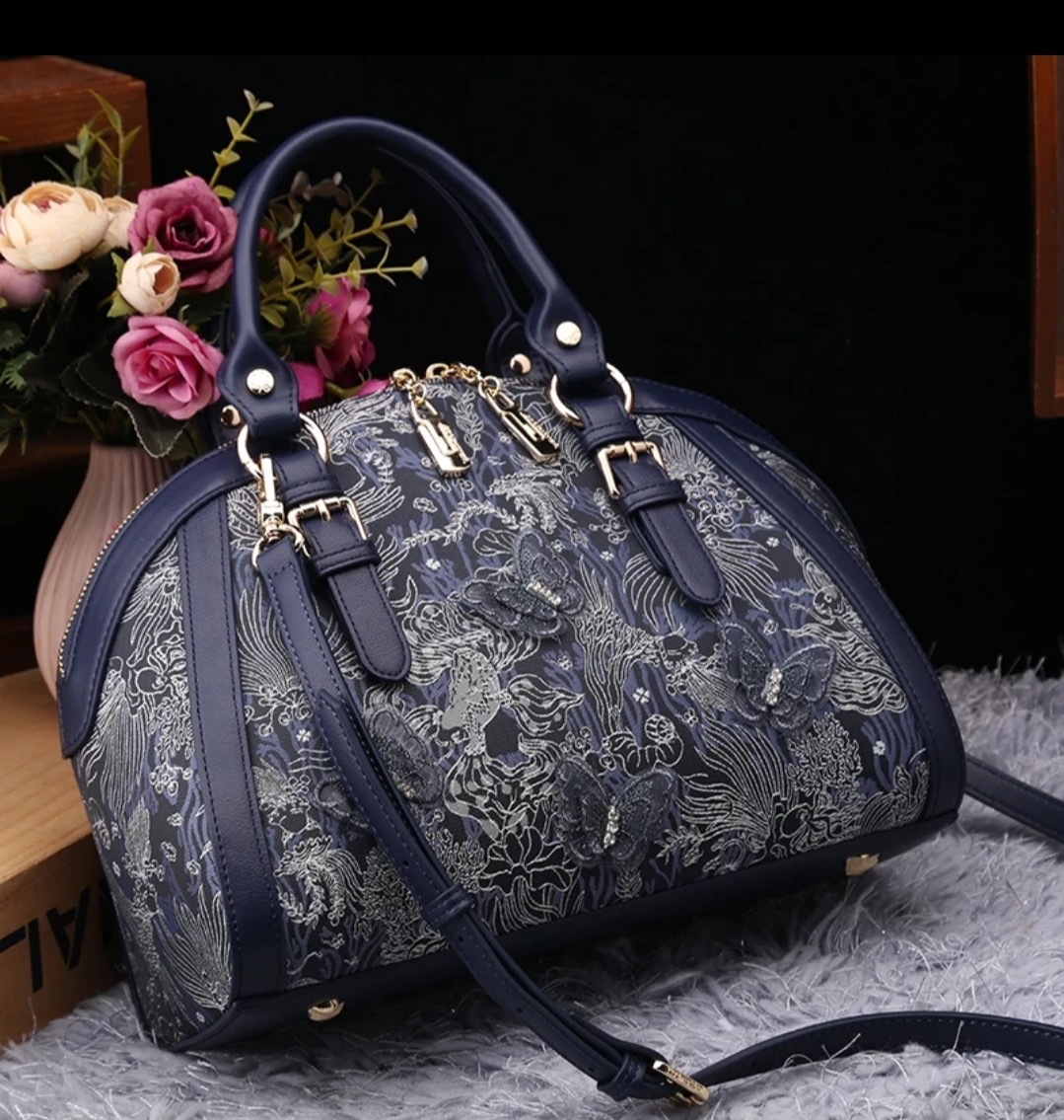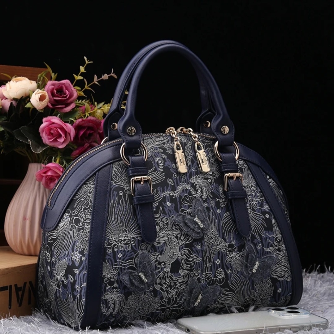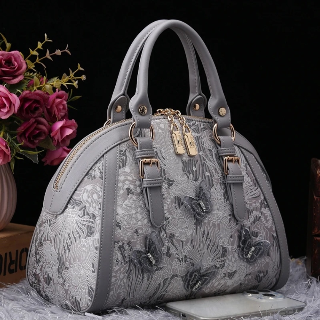 A graceful dome-shaped top-handle satchel with intricate floral jacquard and 3D crystal-accented butterfly appliqués. Polished gold hardware, dual rolled handles and a removable adjustable shoulder strap for crossbody wear. Dimensions: 30 × 22 × 14 cm.