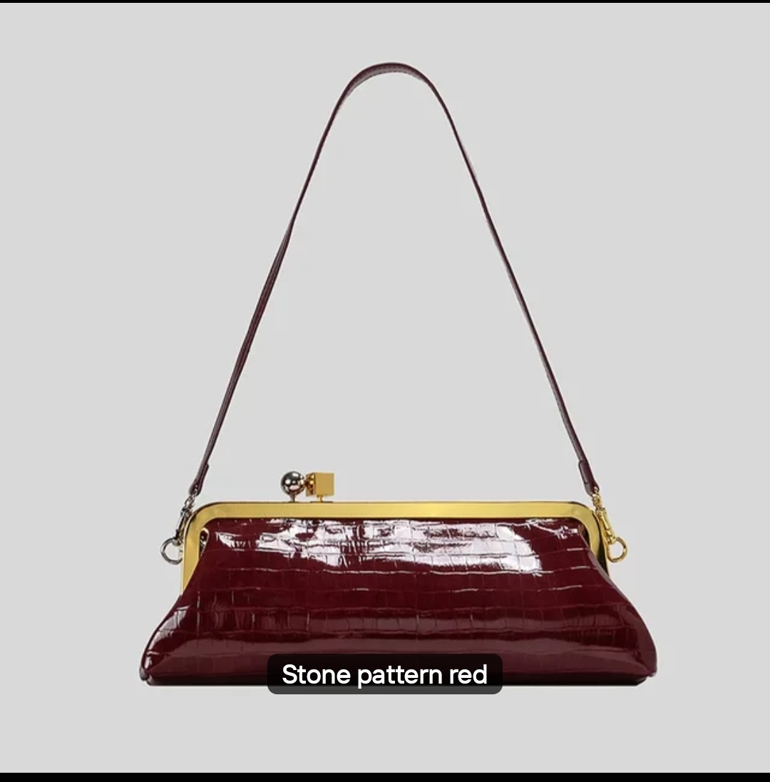 A sculptural framed clutch with a polished gold kiss-lock closure and detachable shoulder strap. Soft napa and glossed croco-embossed leathers, lined in burgundy suede. Crafted in small runs.