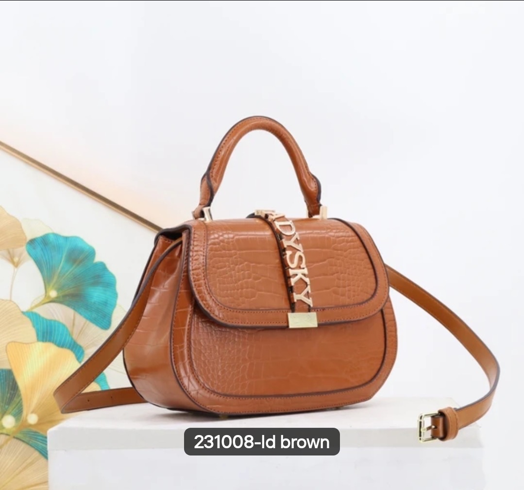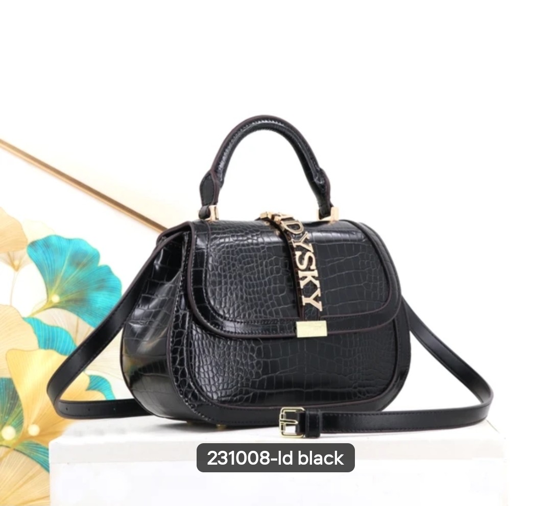 Compact croc-embossed saddle bag with signature LADYSKY hardware, top handle, and adjustable crossbody strap.