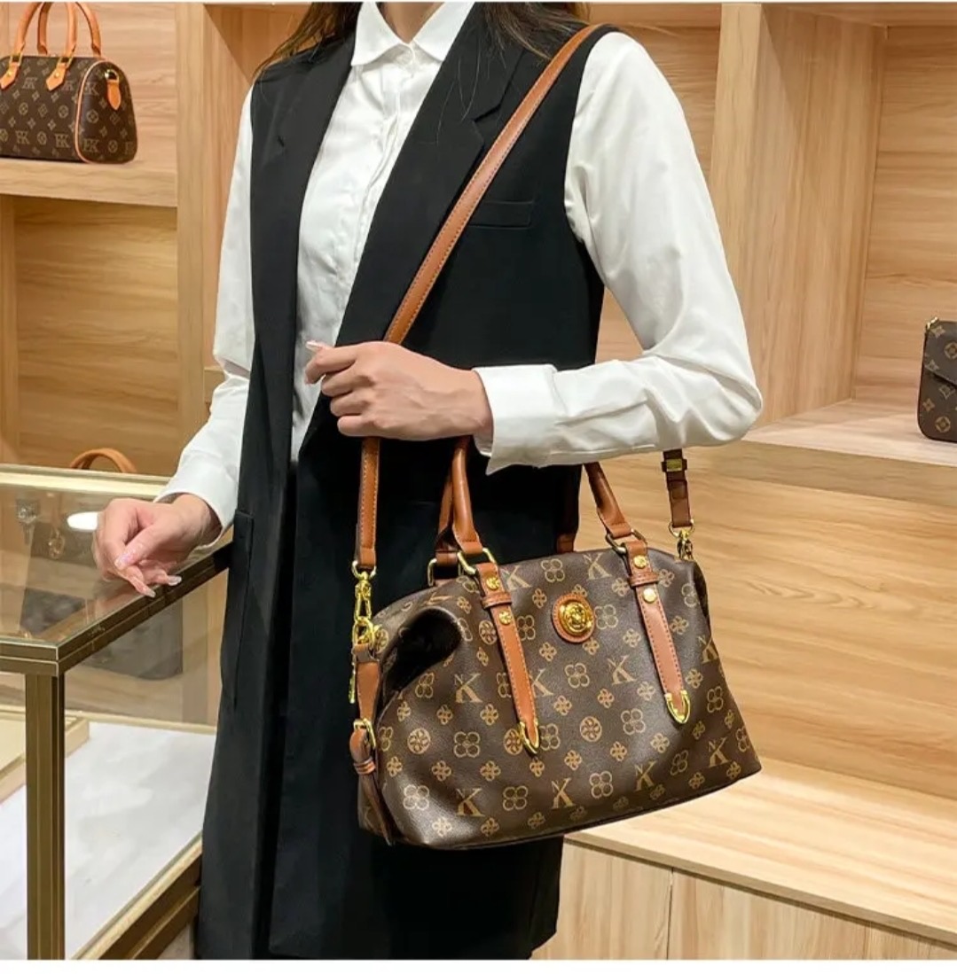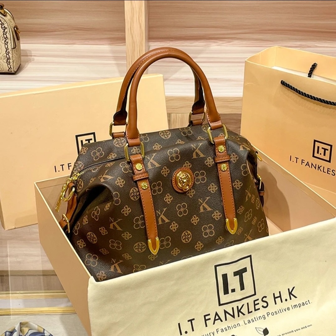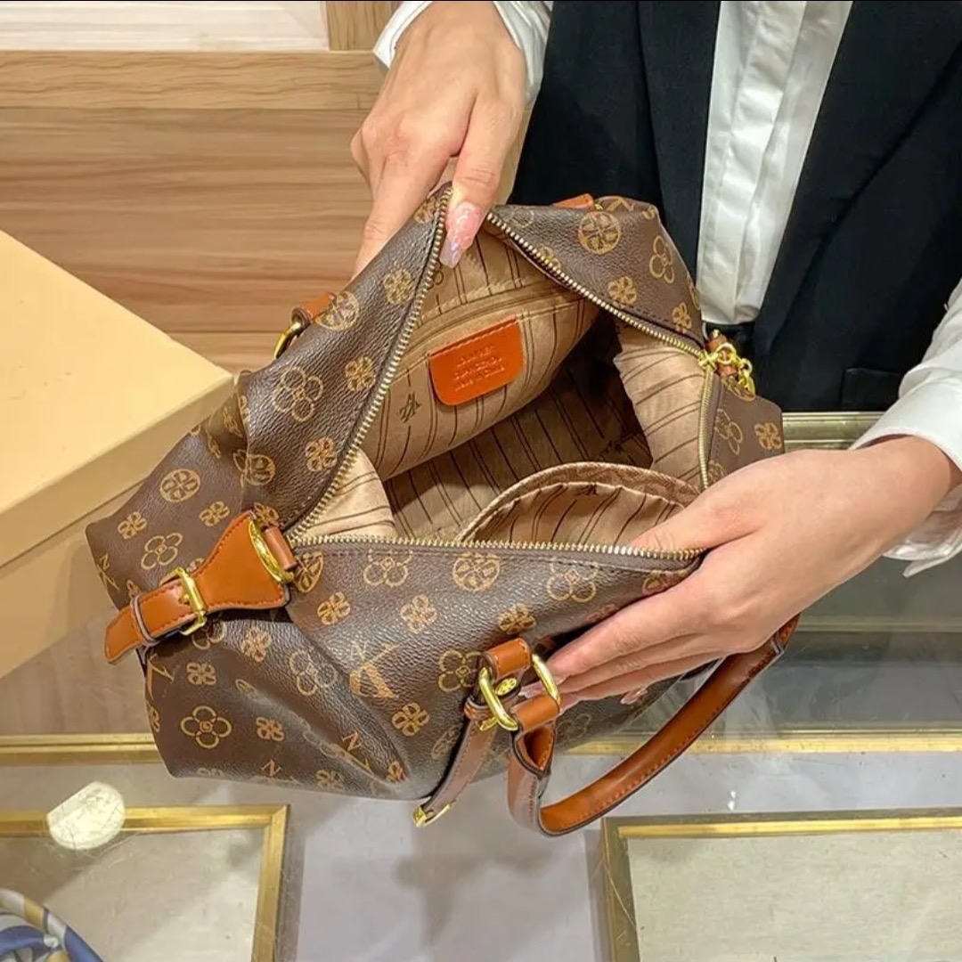 A roomy boston-style top-handle bag in classic monogram canvas with rich cognac leather trim, polished gold hardware and a signature lion medallion at the front. Dual rolled leather handles plus a removable, adjustable shoulder strap for crossbody wear. Striped fabric interior with zip pocket. Dimensions: 30 × 22 × 16 cm.