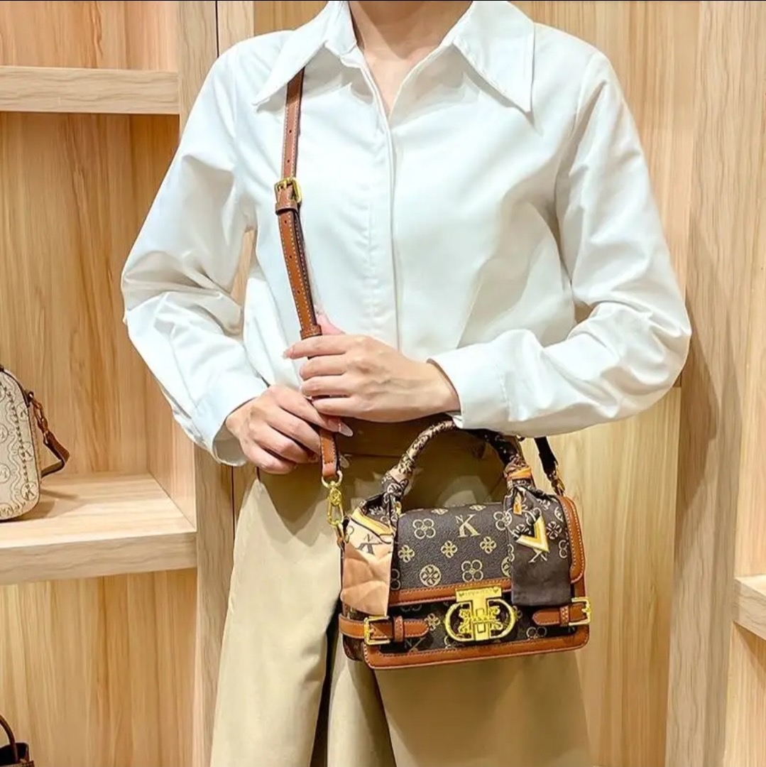Petite monogram-print flap bag with ornate gold lock, scarf-wrapped top handle, and adjustable crossbody strap.