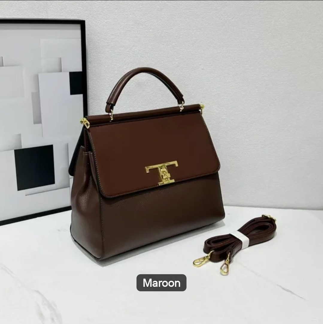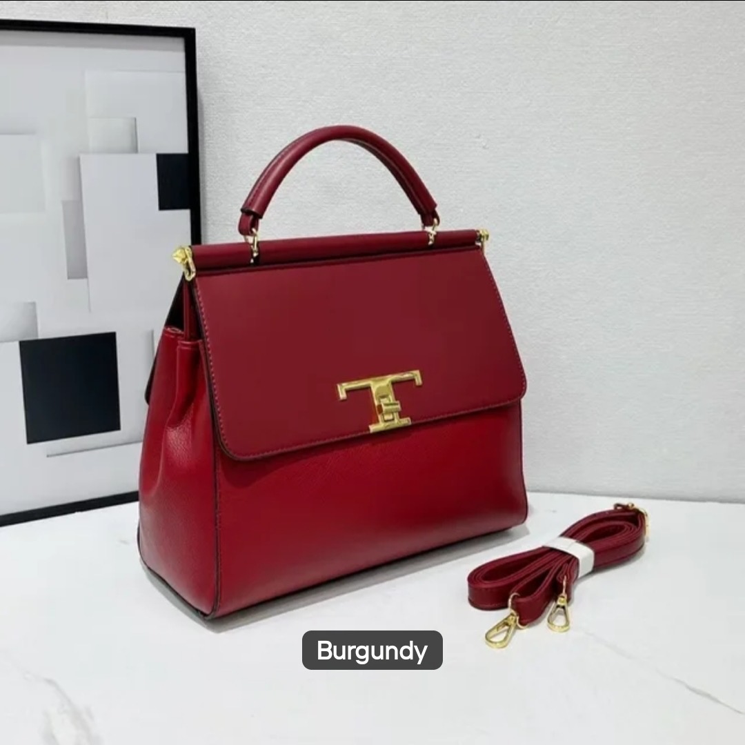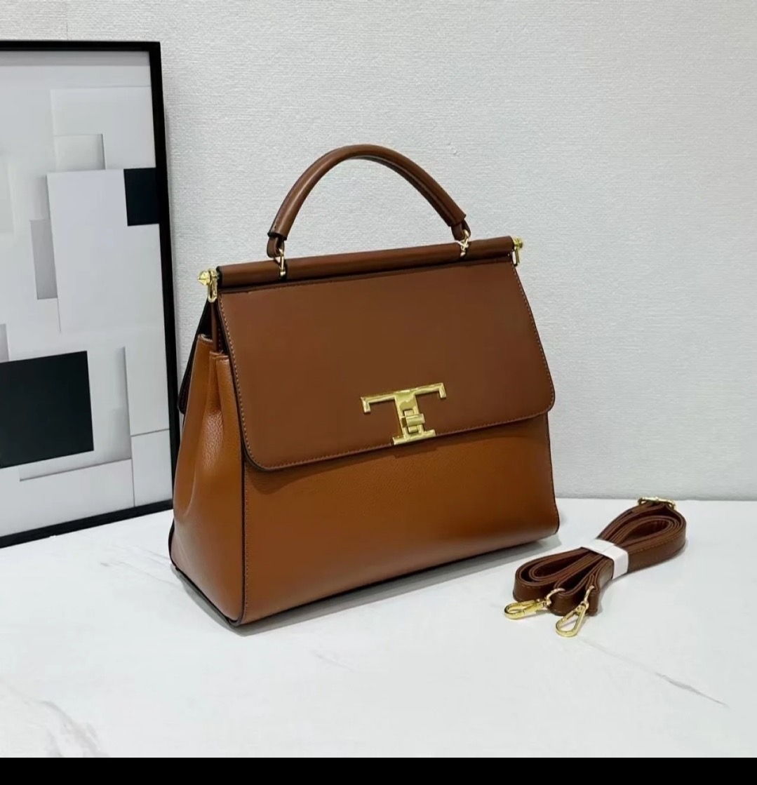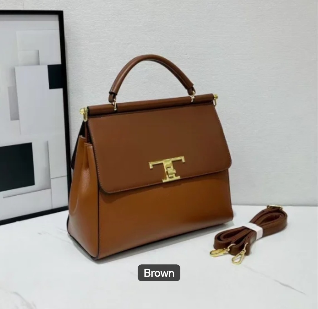 A structured top-handle satchel in smooth pebbled leather, anchored by a polished gold monogram clasp. Includes a removable wide-strap shoulder band for hands-free wear. Roomy, refined, and built for everyday elegance.