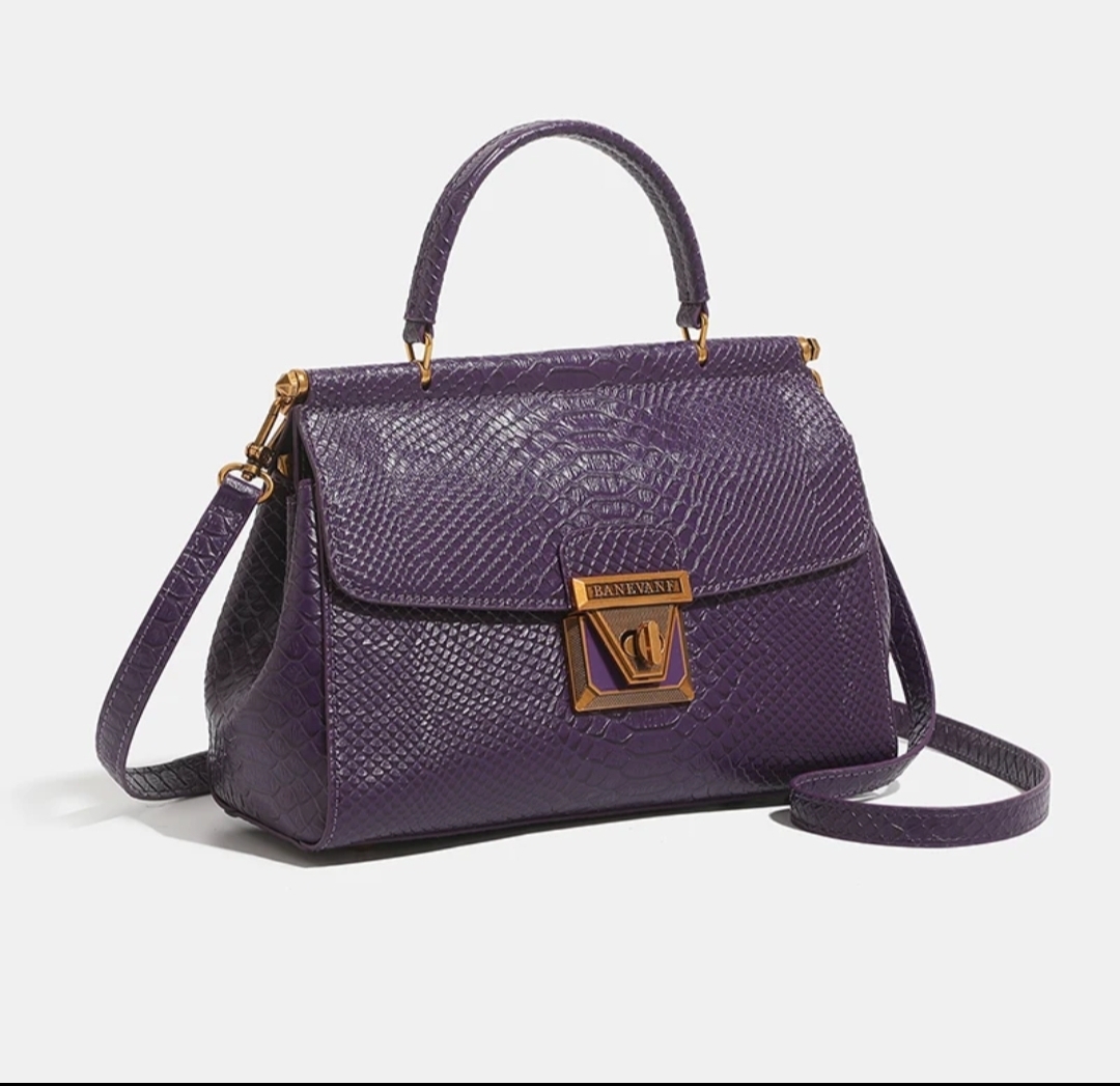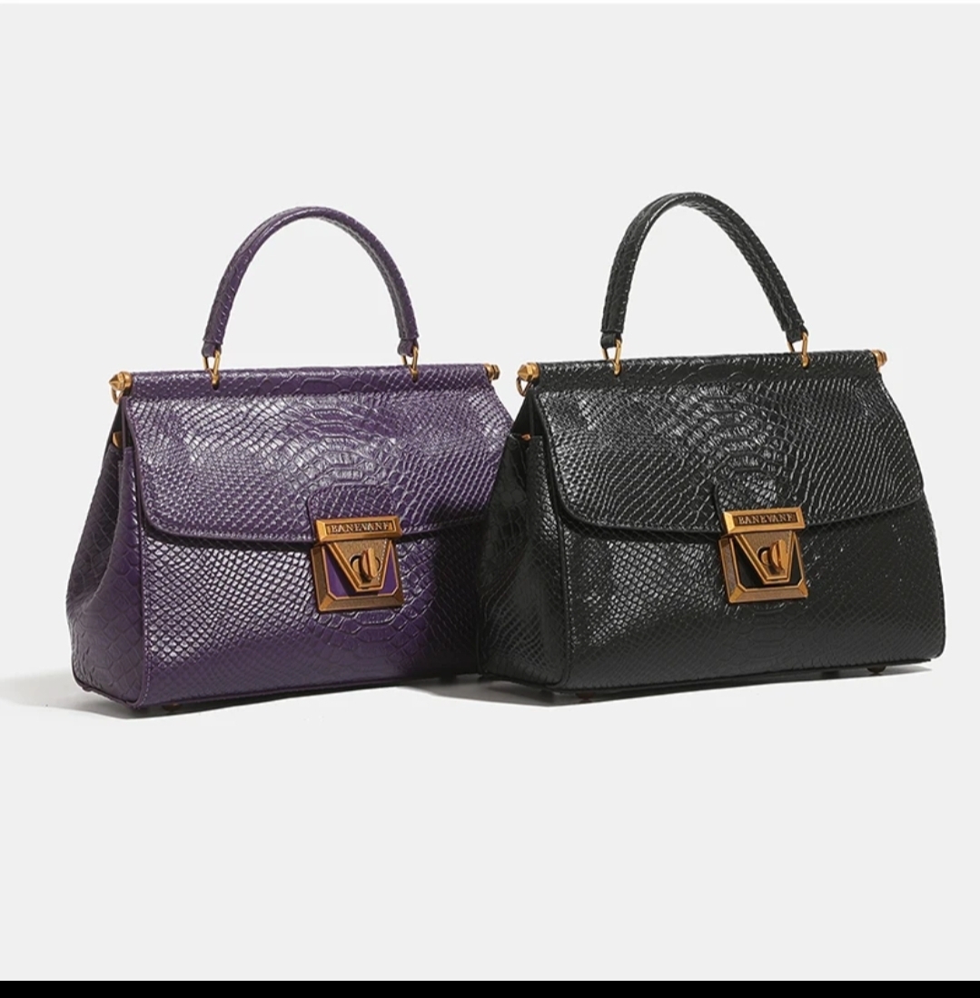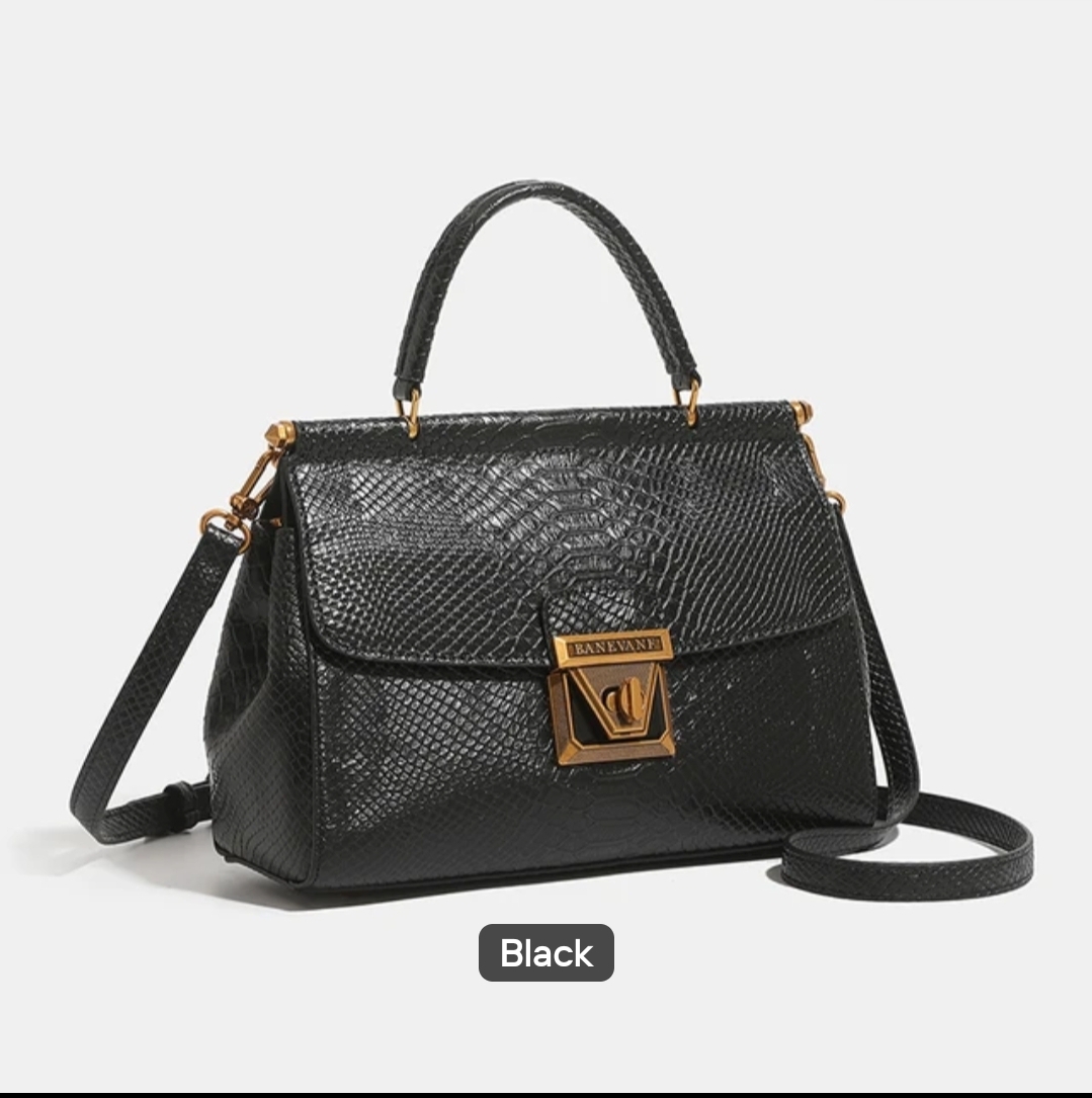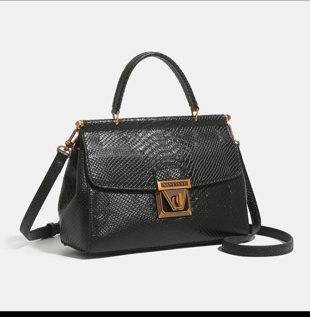 A structured top-handle satchel in embossed python-print leather, finished with an antique-gold turn-lock and a detachable shoulder strap. Roomy enough for the everyday, refined enough for evening.